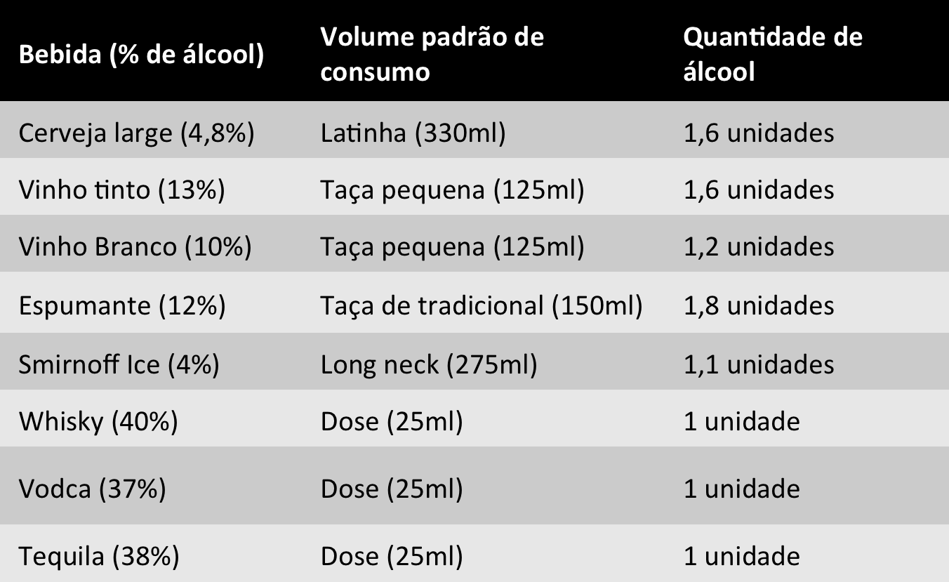A quantidade de álcool varia muito conforme a bebida. Além disso, o volume que bebemos de cada bebida também varia muito. Para diminuir o número de contas que você precisa fazer para descobrir o tempo para eliminar cada uma delas, existe o sistema de unidade de álcool. Uma unidade de álcool corresponde a 10g de álcool puro e demora mais ou menos 1 hora para ser eliminado. A tabela abaixo mostra as bebidas mais comuns e quantas unidades cada uma fornece.