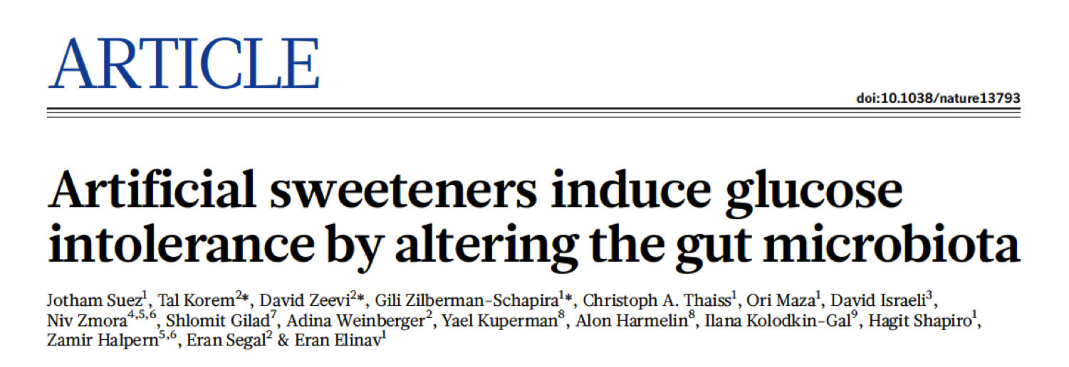 O principal desses estudos foi publicado na revista Nature em outubro de 2014 e mostrou que os adoçantes (sacarina, sucralose e aspartame) podem produzir o que é chamado de intolerância a glicose. Um dos primeiros sinais do início de diabetes tipo II. Esse efeito foi visto tanto em camundongos como em humanos.